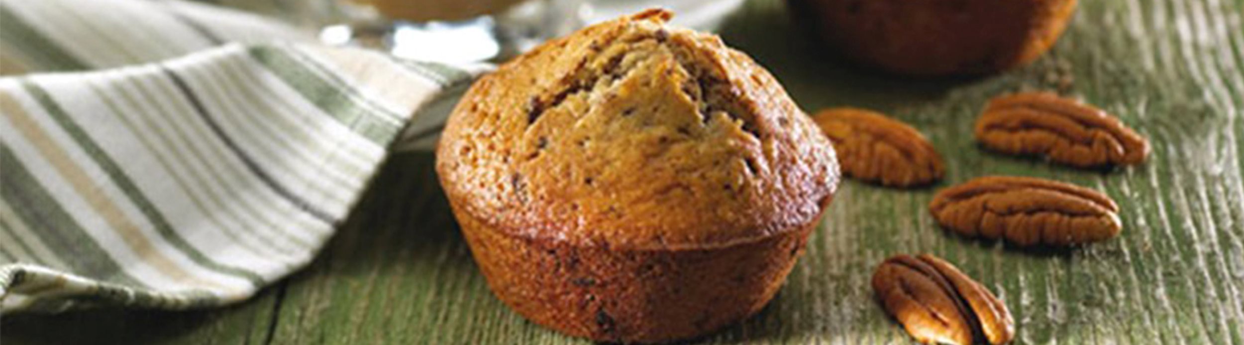 Sätt ugnen på 200° C. Blanda mjöl och bakpulver och tillsätt finmalda pekannötter/valnötter och rörsocker. Vispa ägg, ljus sirap, mjölk och fett, och rör ihop det med torra ingredienser. Hacka choklad, mosa bananen och blanda ned i smeten. Fördela smeten i 12 muffinsformar. Grädda muffinsen i ca 25-30 min. Låt dem svalna en stund på ett bakgaller och ta bort formarna. Gör gärna en glasyr och dekorera muffinsen eller smält lite extra choklad och dekorera varje muffins.