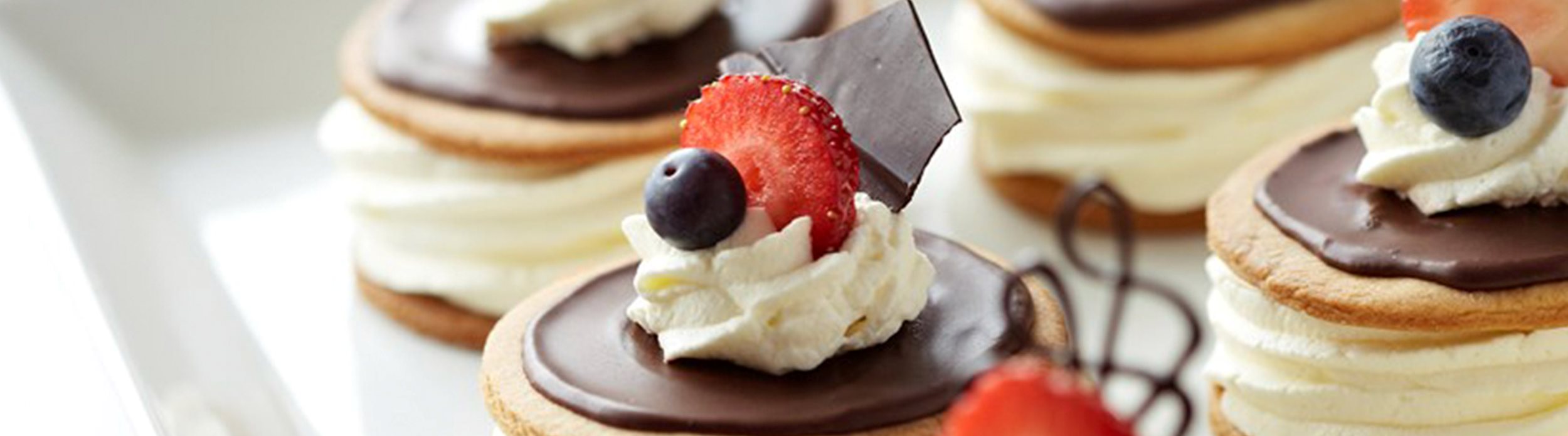Lägg ihop mördegskakorna med tårtkräm, jordgubbsmarmelad och vispgrädde emellan. Bred ett tunt lager chokladglasyr på den översta kakan, spritsa lite grädde och garnera med färska jordgubbar och ev chokladglasyr eller något annat fint.
