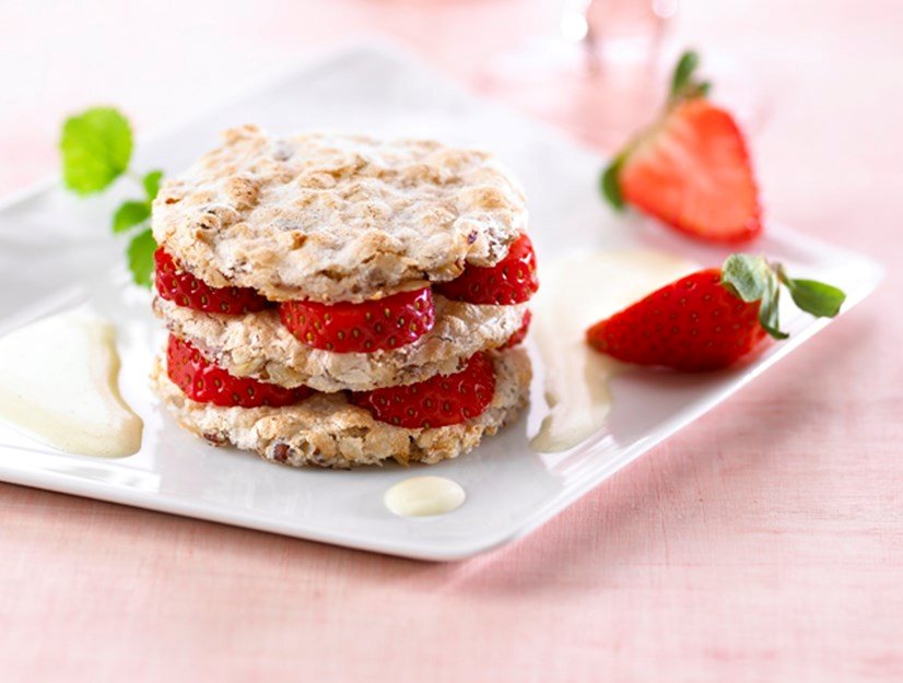 Servering: Skär jordgubbarna i skivor och lägg emellan bottnarna. Lägg lite vaniljkräm ovanpå och avsluta med ett nötmaränglock. Dekorera med vackert skurna jordgubbar, lite florsocker och ev. lite citronmeliss. Det är bara din kreativitet som sätter gränser.