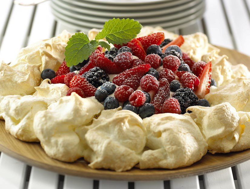 Grädda på nedre falsen i 150 grader i ca 20 minuter. Sänk sedan värmen till 115 grader och låt den stå i 1-1,5 timme, eller tills marängen känns fast. Kanten på formen kan avlägsnas mot slutet av gräddningen. Låt Pavlovan svalna.