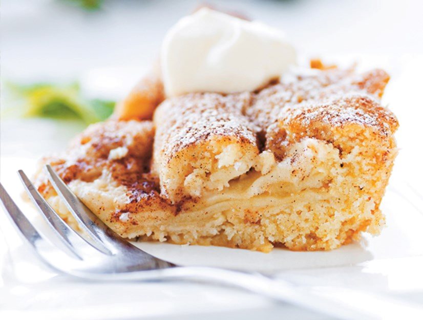 Tryck ut ¾ av degen i en smord, eldfast form. Lägg äppelklyftorna ovan på degen. Kavla ut resten av degen på ett mjölat bakbord, och skär den i strimlor som läggs i ett rutmönster över äpplena. Grädda kakan i mitt i ugnen i 30 min i 175° C och låt den svalna.