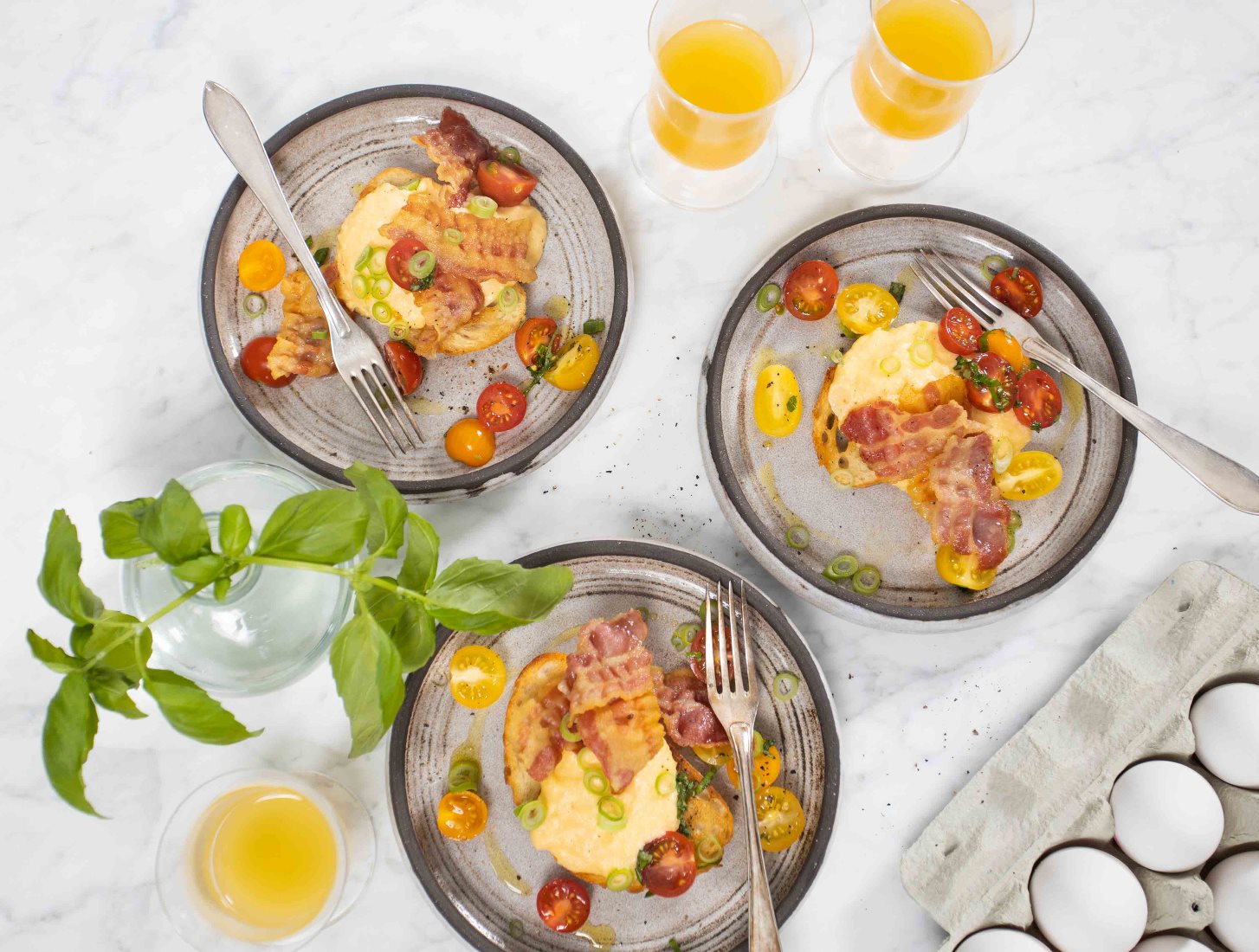 Lägg upp äggröran på bröden, toppa med baconet och fördela på tomatsalladen.