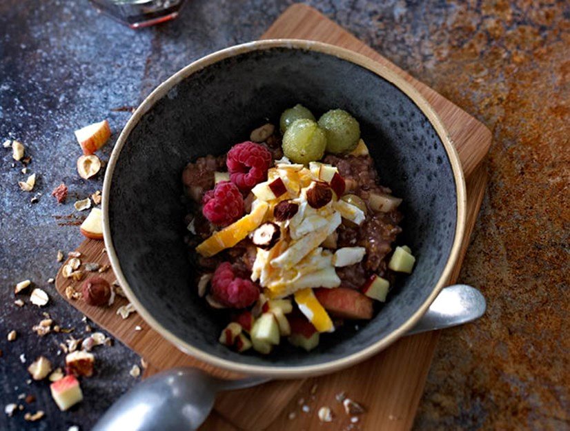Koka upp müsli, saft och salt under omröring. Tillsätt eventuellt lite smör och häll upp gröten i två skålar. Toppa med hackade nötter och bär. Knäck äggen och vispa upp lite lätt med en gaffel. Stek som en platt pannkaka, strö över lite hackade nötter och rulla ihop. Skär i skivor och lägg ovanpå gröten och servera. Strö även över lite rostat och smulat grovt bröd.
