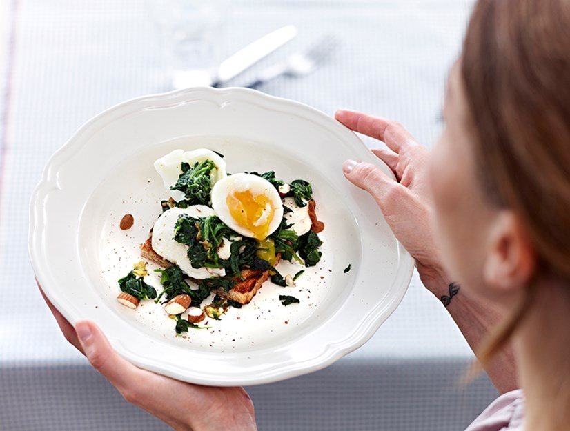 Lägg i spenaten i en stekpanna med lite olja, krydda med salt och peppar och lite riven muskotnöt och lite limesaft. Stek varsamt. Lägg spenaten på de fyra rostade toastbröden, lägg på osten och sätt in den i ugnen i 4 minuter i ca. 200 grader. Du kan också lägga bröden i stekpanna och låta osten smälta lite på svag värme utan att bränna bröden. Lägg de mjukkokta äggen på osten, gör gärna ett litet snitt i det så att gula flyter ut lite snyggt över toasten.
