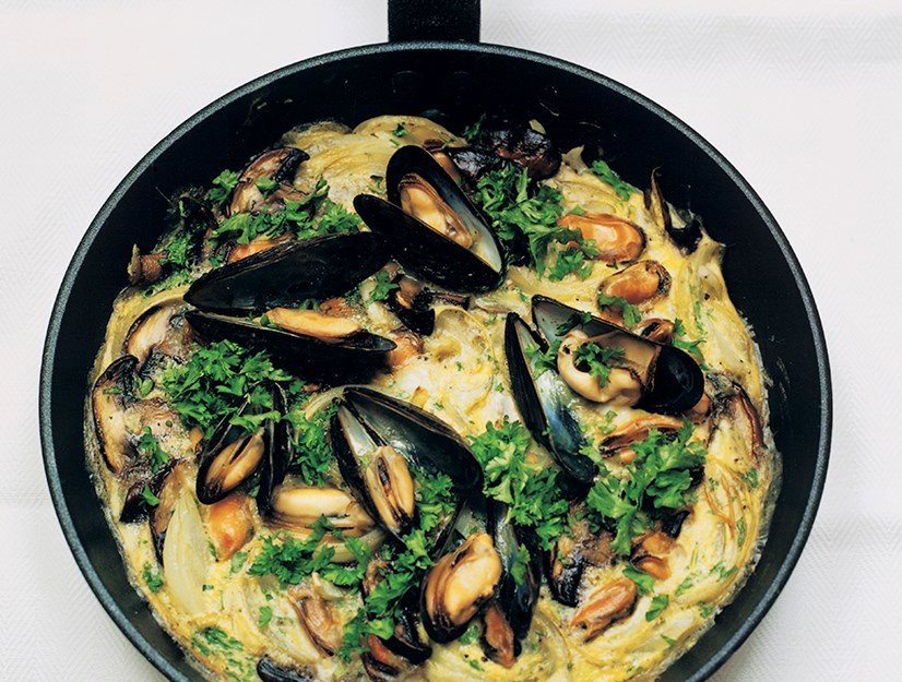 Spara 6-7 fina musslor i sitt skal. Tag ur resten av musslorna ur skalen. Skala och finhacka scharlottenlöken och vitlöken. Rensa och skiva champinjonerna. Stek champinjonerna i olivolja på hög värme i 1-2 minuter. Tillsätt de urtagna musslorna och löken. Stek vidare i ett par minuter. Salta och peppra och lägg sedan i en skål. Skölj ur pannan. Smält smöret i pannan. Rör samman äggen med lite salt och häll i. Tillsätt champinjonerna, persiljan och musslorna, även de med skal. Stek på låg värme tills omeletten har stelnat. Servera på en gång.