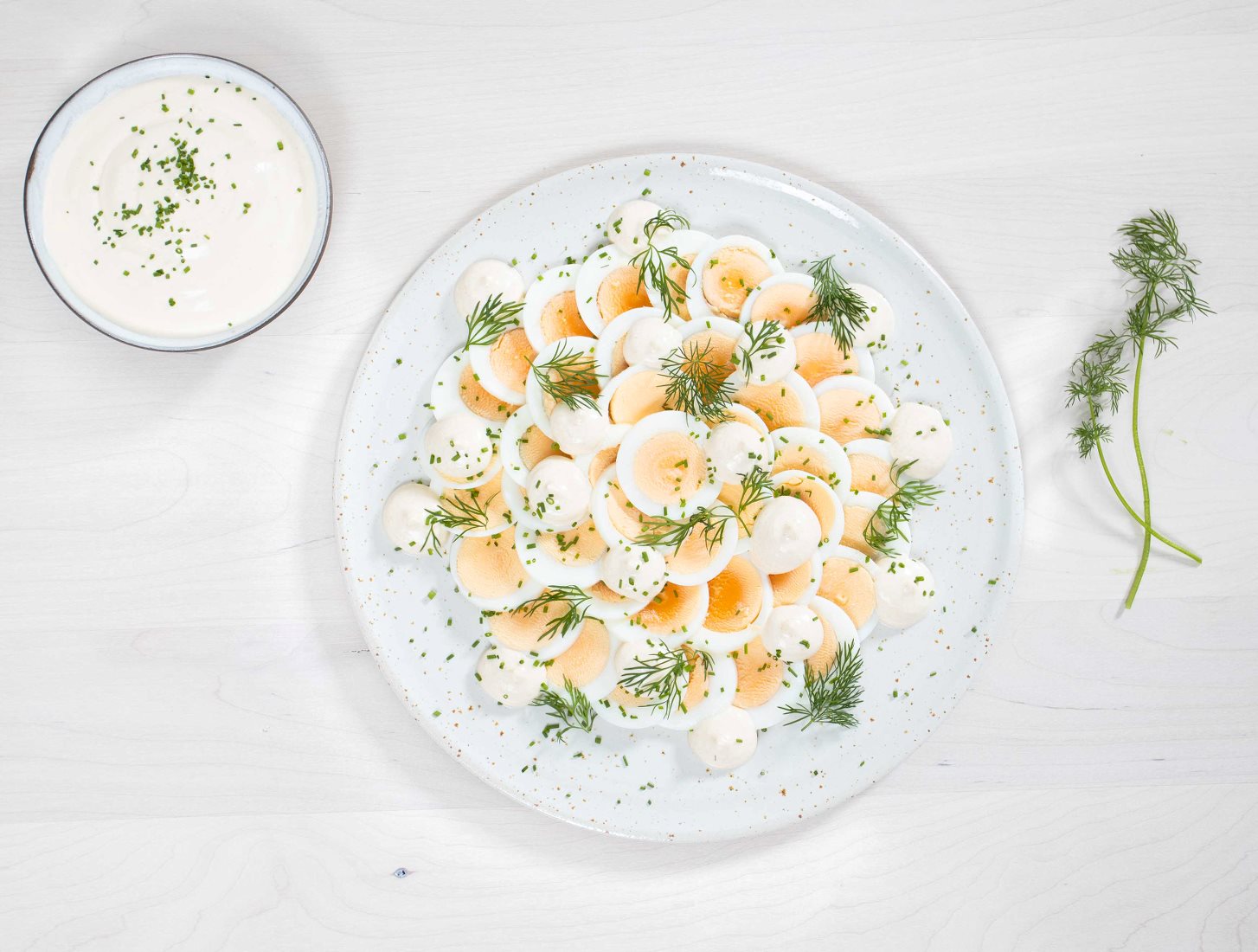 Placera äggskivorna omlott på ett fat och toppa med kaviarcremen, gräslöken och små dillkvistar.