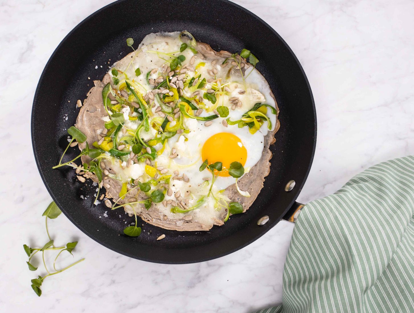 Finstrimla purjolöken och fräs den i lite olivolja ett par minuter på medelhög temperatur. Smaka av med salt.Värm en stekpanna med lite olivolja till medelhög temperatur. Häll ner lite av smeten så att du får en tunn galette (pannkaka). Låt den steka i ca 20 sekunder och knäck därefter ner ägget. Stek vidare tills äggvitan stannat. Smula då över chèvren och toppa med purjolöken och solroskärnorna. Upprepa sedan detta med de övriga galetterna.