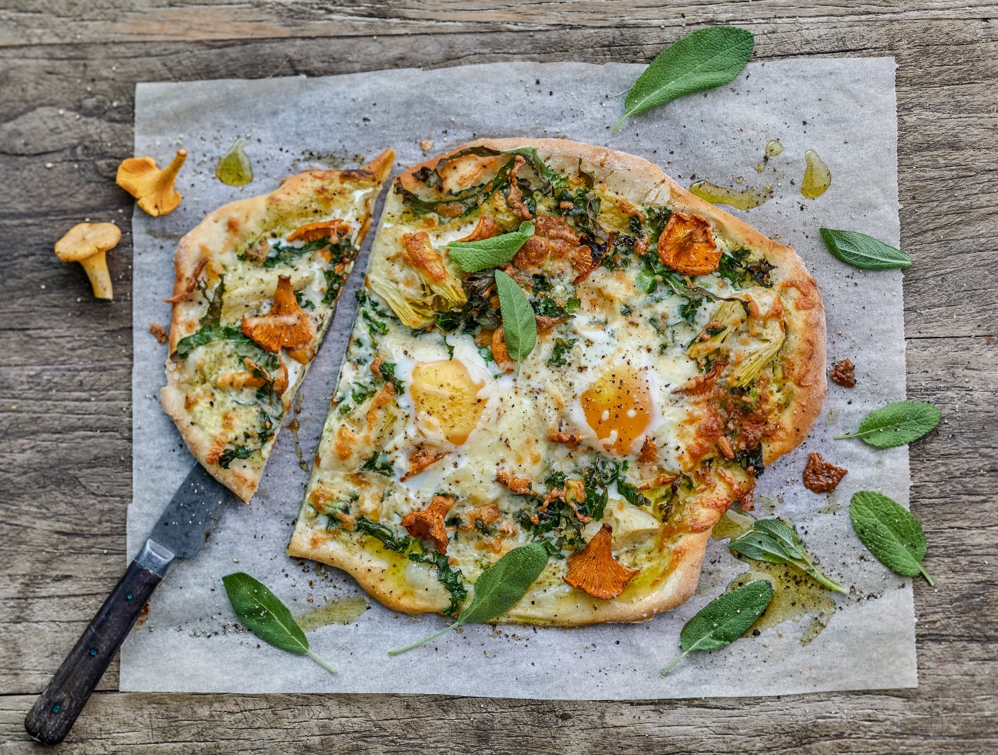 Smula jästen i varmt vatten. Blanda de andra ingredienserna och knåda degen. Låt degen jäsa i en bunke under en handduk. Rulla degen till två st runda pizzadegar. Lägg dem på pappersklädd bakplåt. Blanda creme fraiche, pestosås, salt och peppar och häll det över pizzadegen. Tillsätt övriga ingredienser och knäck försiktigt äggen över pizzan.