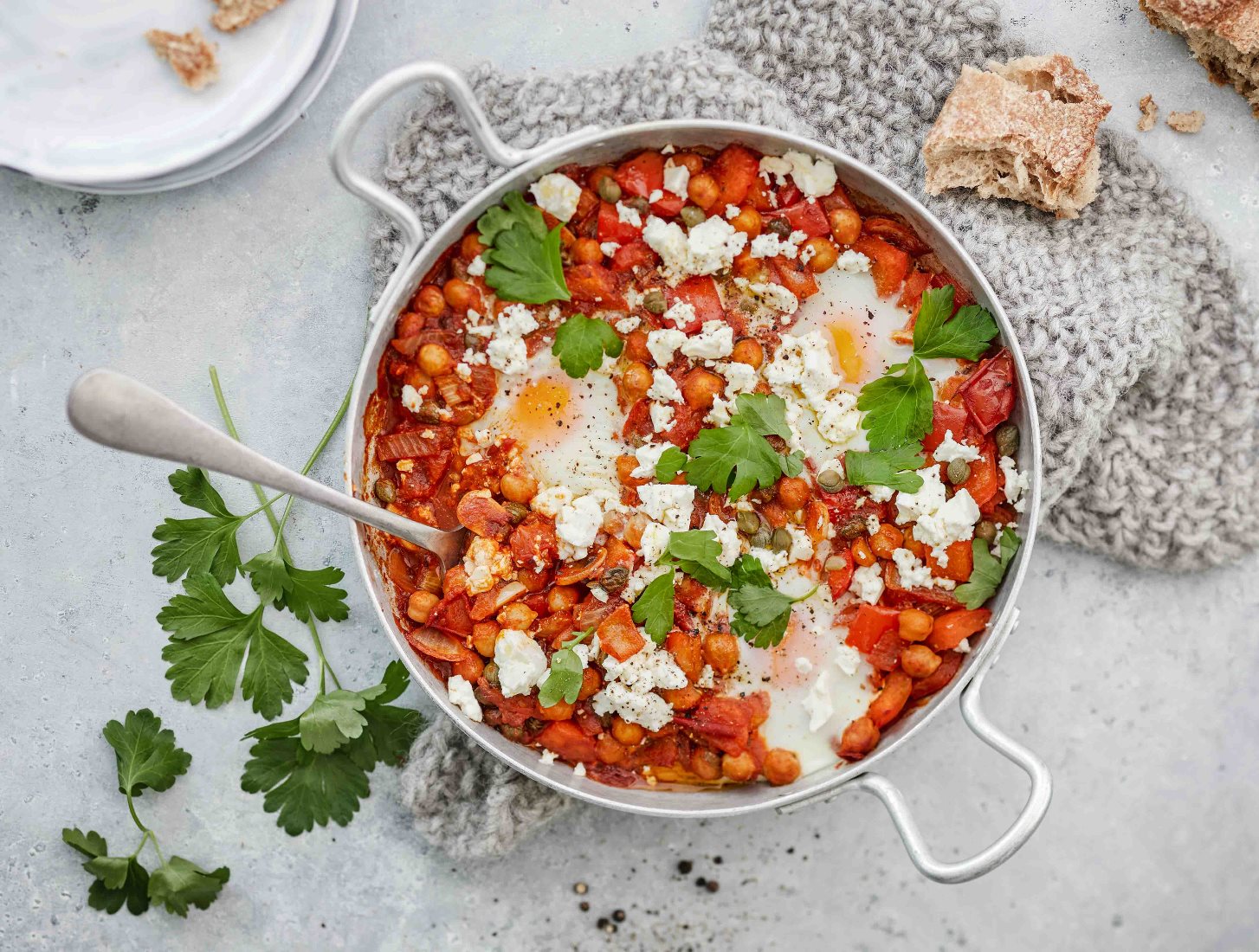 Hacka löken och tärna paprika. Stek löken, paprika och kryddor i olja i en kastrull eller stekpanna. Tillsätt tomatpuré, tärnad färsk tomat, sköljda kikärter och kapris i pannan. Låt det sjuda varsamt i cirka 15 minuter. Gör fyra hål i pannan och knäck äggen i dem. Lägg locket eller folie över pannan och låt det sjuda på låg värme. Äggulorna kommer att vara lösa. Avsluta med smulad fetaost, färsk koriander och citronsaft.