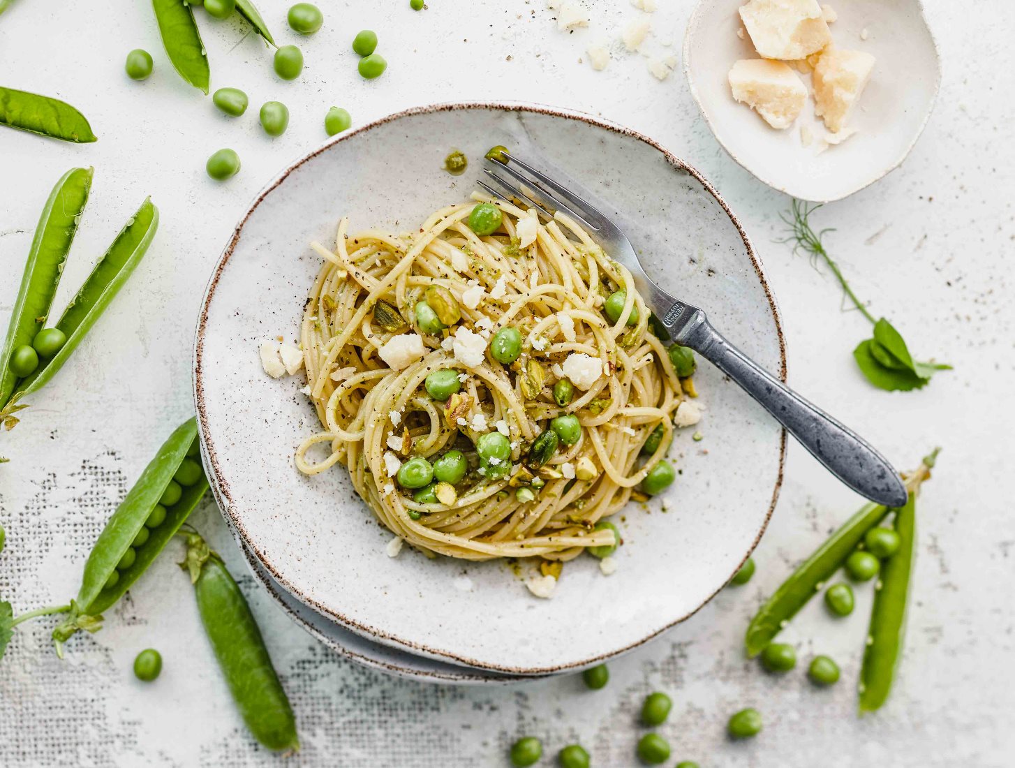 Koka pastan i saltat vatten. Spara 1 dl pastavatten. Blanda ägg, pestosås och tinade ärtor i en stekpanna, på låg värme. Ta bort stekpannan från spisen och tillsätt pasta. Blanda och avsluta med parmesanost, nötter och peppar. Tillsätt 1 dl kokande vatten om du vill ha en krämigare pasta.