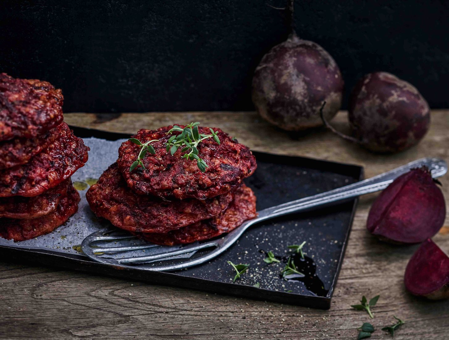 Skala och riv rödbetorna och halloumi-osten. Finhacka lökarna. Tillsätt resten av ingredienserna och blanda väl. Låt degen svälla i ungefär en halvtimme. Forma biffarna för hand och lägg dem i en smörad ugnsform.